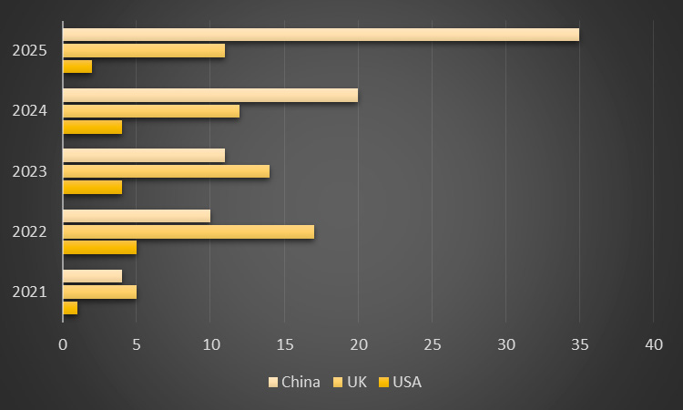 Un aspect particulièrement intéressant réside dans la prédiction des auteurs selon laquelle, au cours des trente prochaines années, la monnaie deviendra entièrement numérique, prenant la forme de cryptomonnaies et de CBDC. L’examen des données comparatives issues de l’indice annuel mondial d’adoption des cryptomonnaies de Chainalysis (voir figure: Indice mondial d’adoption des cryptomonnaies, 2021-2025) met en évidence une divergence nette entre les grandes puissances: les États-Unis s’orientent davantage vers les cryptomonnaies décentralisées, tandis que la Chine s’en éloigne. En effet, la Chine développe activement sa propre CBDC (le e-CNY) tout en ayant interdit presque toutes les cryptomonnaies privées et les stablecoins en 2021. À l’inverse, les États-Unis ont interrompu leurs travaux sur une CBDC de détail et soutiennent désormais la monnaie numérique privée dans un cadre réglementaire.