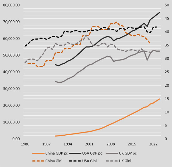 Living standards and income inequality in China, USA and UK (1980–2024)
